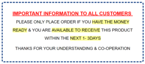 โ CAUTION!!!: Please do not order if cash is not available, if you are not ready to pick up, if you are travelling within the period. Except if someone will pick it on your behalf. Itโs Easy To Order! Fill The Form Below With Your Correct Delivery Details. Weโll Call You To Arrange Your Delivery, Please Keep Your Phone Close To Take Calls.